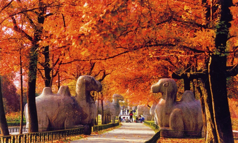 秋になると、石像路はいつも多く観光客が集まる。紅い楓、黄色の銀杏、オレンジ色のナンキンハゼ、黄褐色の梧桐、緑のイブキは厳かな石像路を飾っている。